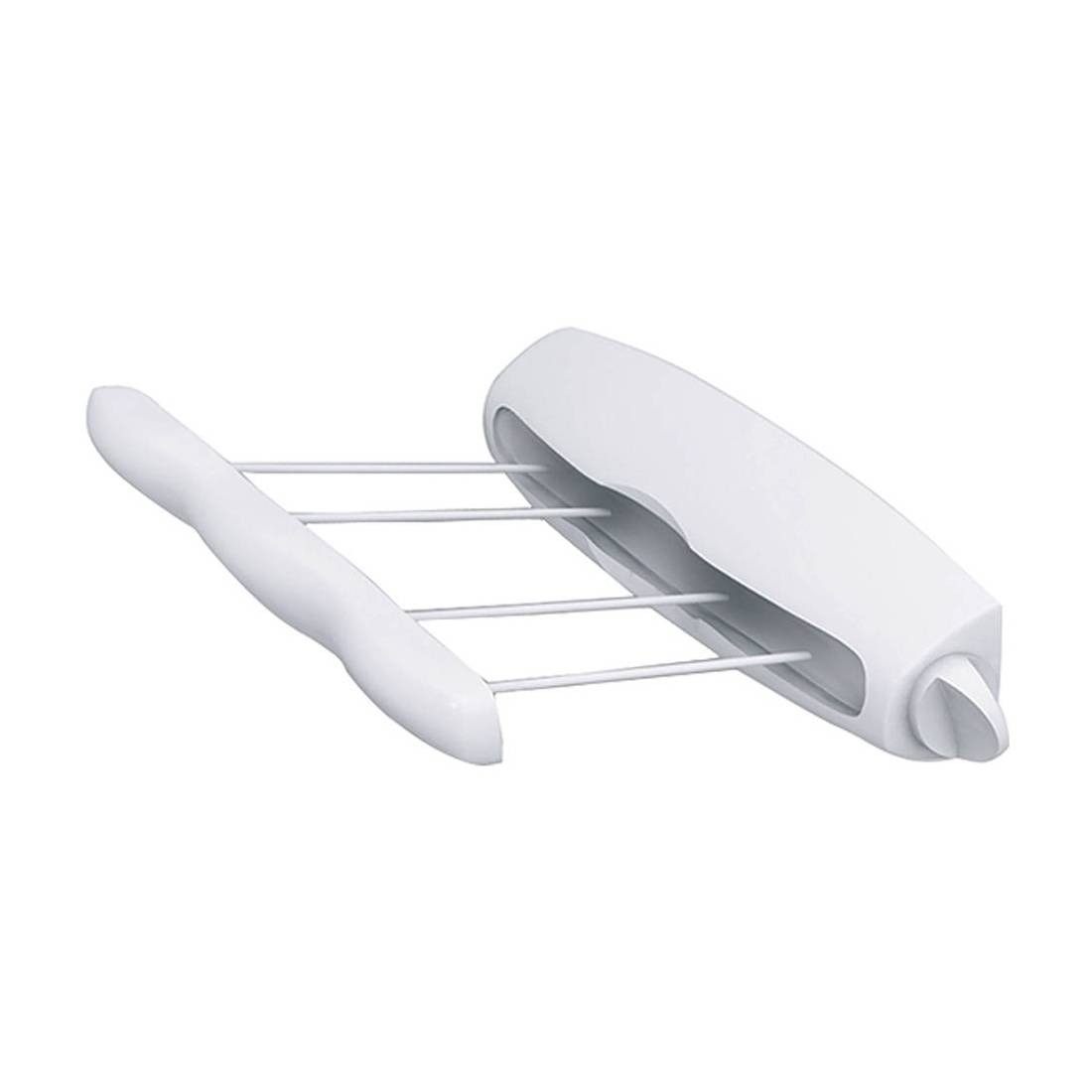 Stendibiancheria a parete in resina con 4 fili retraibili automaticamente. Dotato di sistema di bloccaggio dei fili e aggancio a parete appenditutto. Spazio di stenditura: 14 mt.