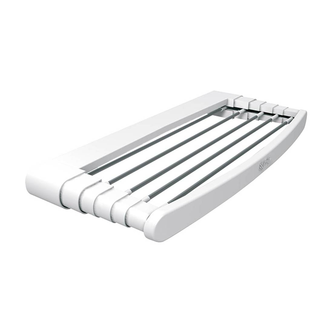 Stendibiancheria da parete in alluminio e resina versatile e salvaspazio. Fili grossi che evitano le pieghe sui capi asciutti. Richiuso diventa una pratica mensola o portasciugamani. Spazio di stenditura: 5 mt.