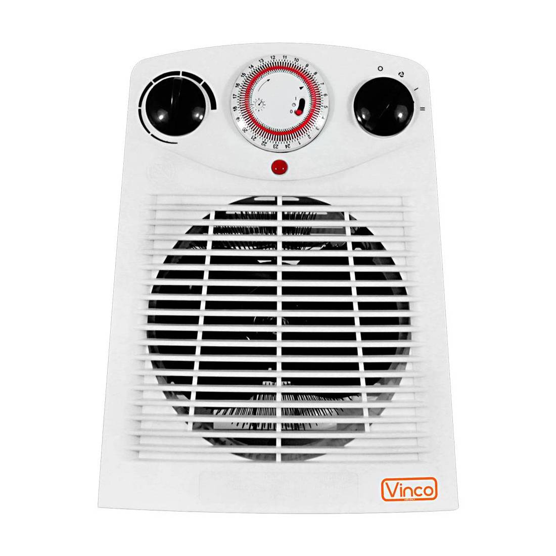 Con timer 24 h. Due potenze selezionabili: 1000/2000 W, protezione anti surriscaldamento, termostato. Funzioni: caldo-tiepido-aria ventilata. Dimensioni: 220x150x290 mm.