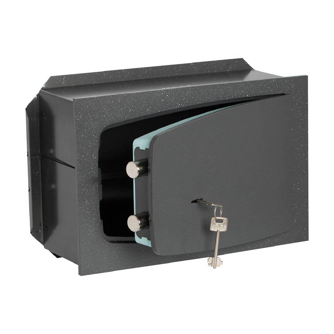 Catenacci girevoli in acciaio nichelato Ø 22 mm. Speciale verniciatura a forno ad alta resistenza contro la corrosione. Piastra di protezione della serratura in acciaio carbonitrurato, serratura a meccanismi fissati direttamente sullo sportello della cassaforte. Assembalggio dei componenti di tenuta con saldature robitizzate. Dimensioni (LxHxP).