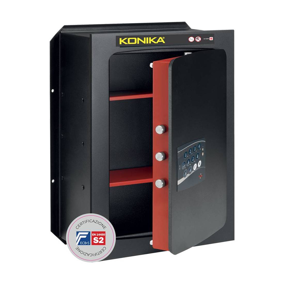 Taglio laser high tech, telaio frontale monoblocco con luce dii taglio tra cornice e battente di soli 2/10 mm. Frontale monoblocco in acciaio speciale di alto spessore 10 mm. Apertura a tutto vano, cerniera maggiorata con bronzine autolubrificanti, ancorata al frontale in posizione defilata. Saldatura ad alta resistenza completamente robotizzata. Tastiera a membrana a 12 tasti. Verniciatura epossidica con doppia fosfatazione, speciali battute della porta appositamente realizzate per resistere efficacemente ai tentativi di sfondamento. Alette di ancoraggio ricavate sui quattro lati del fondo con funzione antistrappo. 2 ripiani, catenacci 3+2. Antisfondamento, realizzata con tecnologia laser system 3D a 45°: il cui taglio tra porta e cornice ne impedisce lo sfondamento. Livello di sicurezza S2 secondo EN 14450:2017 e ECB.S C10.