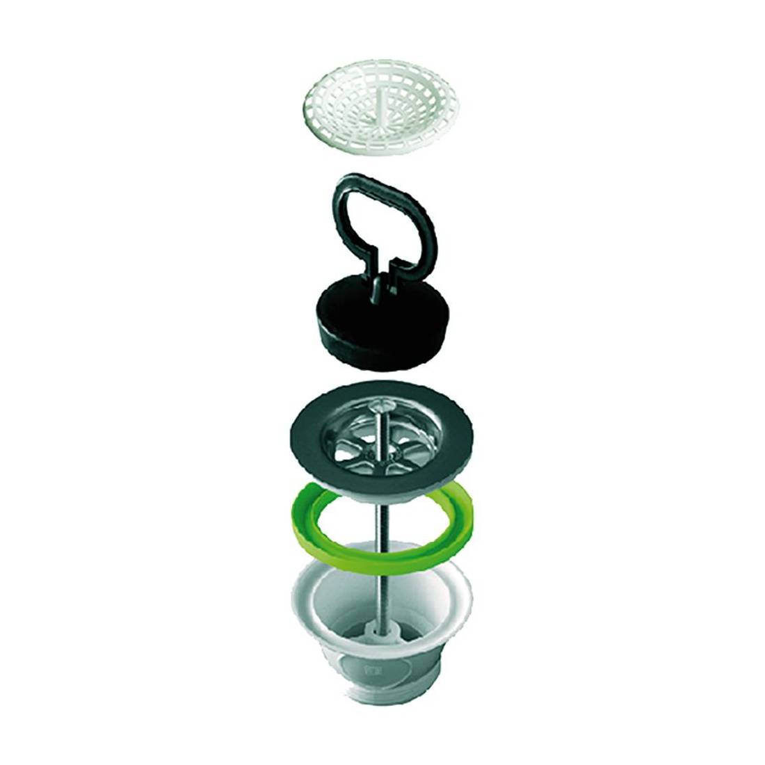 In polipropilene e acciaio inox.Senza troppo pieno. Per lavelli inox.