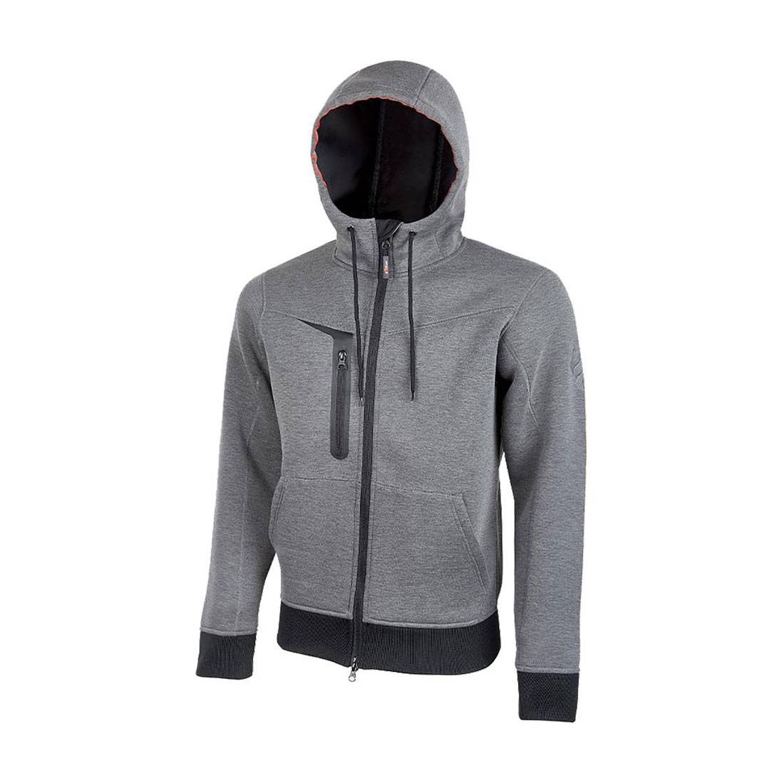 Utilizzo invernale. Chiusura centrale con zip intera doppio cursore. Utilizzo invernale. In tessuto jersey elasticizzato, 5% spandex, 28% rayon, 330 gr/m2. Cappuccio con fettuccia reflex sul bordo. Due tasche frontali, tasca multimediale sul petto lato destro con uscita per auricolare. Polsini e cintura in resistente costina elasticizzata. Fori di aerazione posizionati sotto le ascelle per garantire miglior comfort. A norma EN ISO 13688:2013.