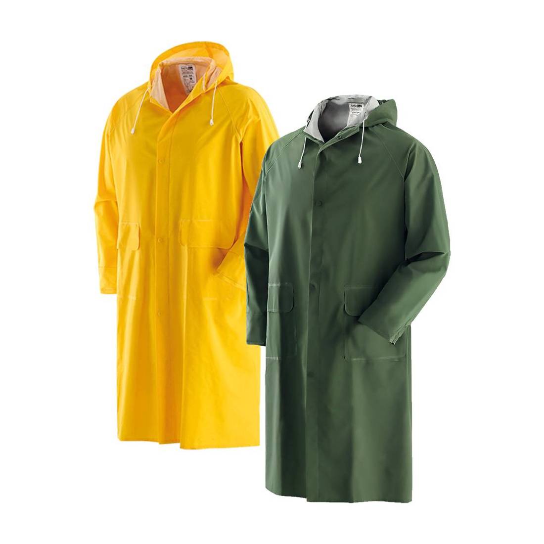 Tessuto impermeabile bispalmato in PVC/ poliestere/ PVC. Cappuccio fisso con cordino, chiusura con bottoni.