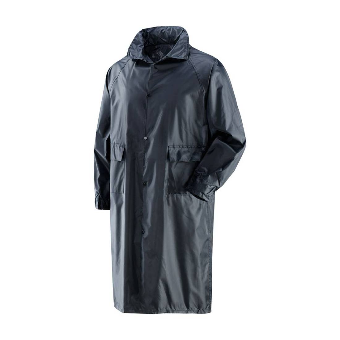 Tessuto impermeabile in nylon spalmato internamente in PVC. Manica con elastico stringipolso interno, aerazione sul dorso e sotto le ascelle. Cappuccio fisso a scomparsa con coulisse e 2 tasche con patta antipioggia. Chiusura con bottoni automatici. Spessore 0,18 mm, peso 200 g/m2. Colore blu.