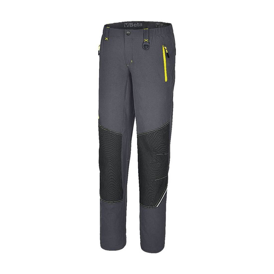Realizzato in 90% nylon, 10% tessuto elasticizzato, 140 gr. Inserti rinforzati su ginocchia e retro, vita elasticizzata. Due tasche in vita e tasca posteriore, tutte con chiusura zip. Fondo gamba elasticizzato regolabile. Colore grigio con dettagli gialli.