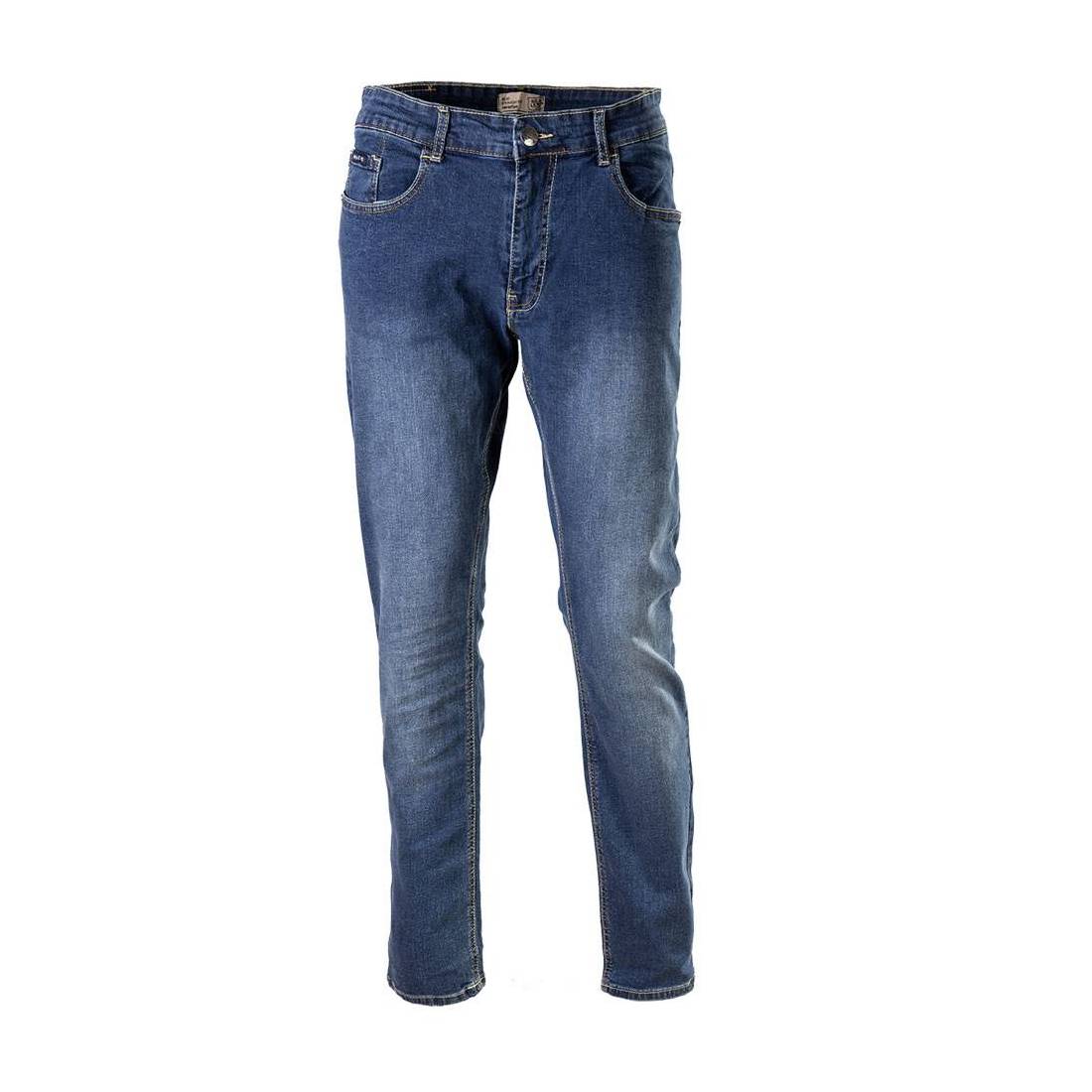 In 98% cotone, 2% elastane. Tessuto Denim Stretch Fibredlex.Taglio classico, passanti in tessuto. A 2 tasche principali, 2 tasche posteriori, 1 taschino porta monete. Chiusura centrale con zip, bottone in vita. Peso 366 gr/mq. Colore blu.