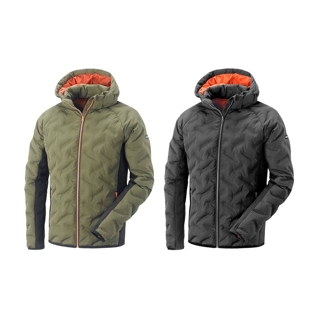 Realizzato in poliestere 100% riciclato. Membrana in TPU, tessuto trapuntato a ultrasuoni antigoccia. Imbottitura in polietilene espanso, fodera interna in poliestere peso 55-60 gr/mq. Taschino interno e due tasche in vita con zip. Dettagli laterali in softshell elastici, colletto antivento. Cappuccio regolabile e staccabile. DPI I categoria (rischi minimi). Regolamento UE 2016/425. Peso tessuto 220 gr/mq.