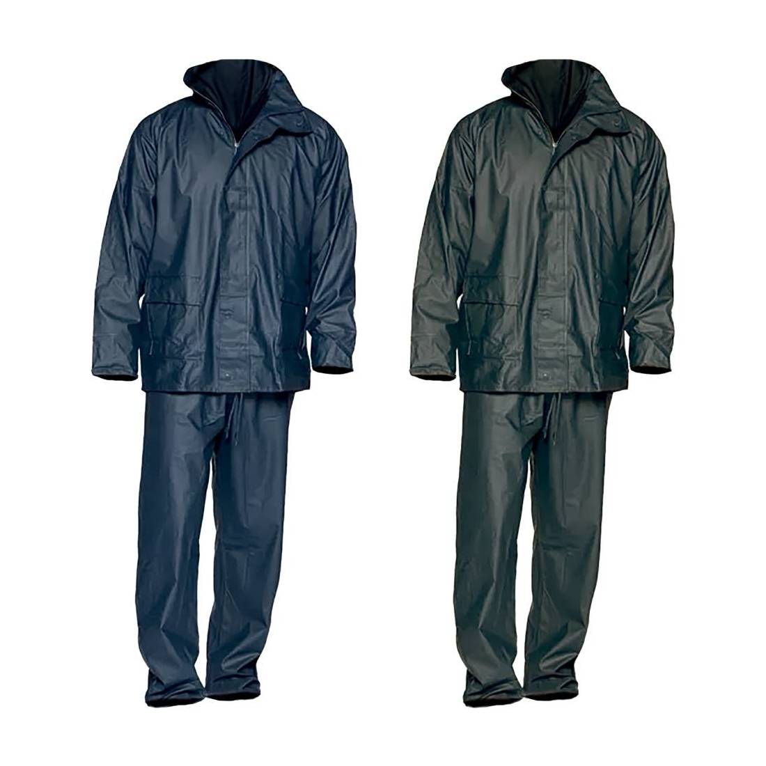In tessuto impermeabile pvc e poliuretano. Giacca con cappuccio richiudibile nel collo, chiusura con cerniera ricoperta da pattina con bottoni, doppia tasca laterale, stringi-polso con bottone, coulisse in vita, interno manica con polso elasticizzato. Pantalone con elastico e coulisse in vita, apertura laterale con cerniera sul fondo gamba. DPI I categoria, marcatura CE. Peso tessuto 300 gr/m2.