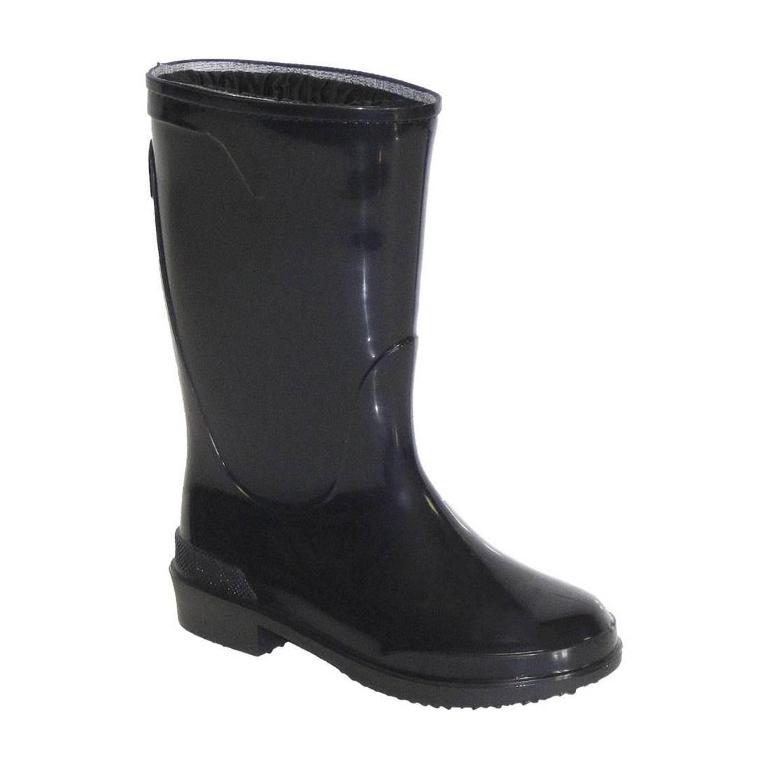 In PVC. Con fodera in tessuto di cotone, suola calandrata. Colore nero.