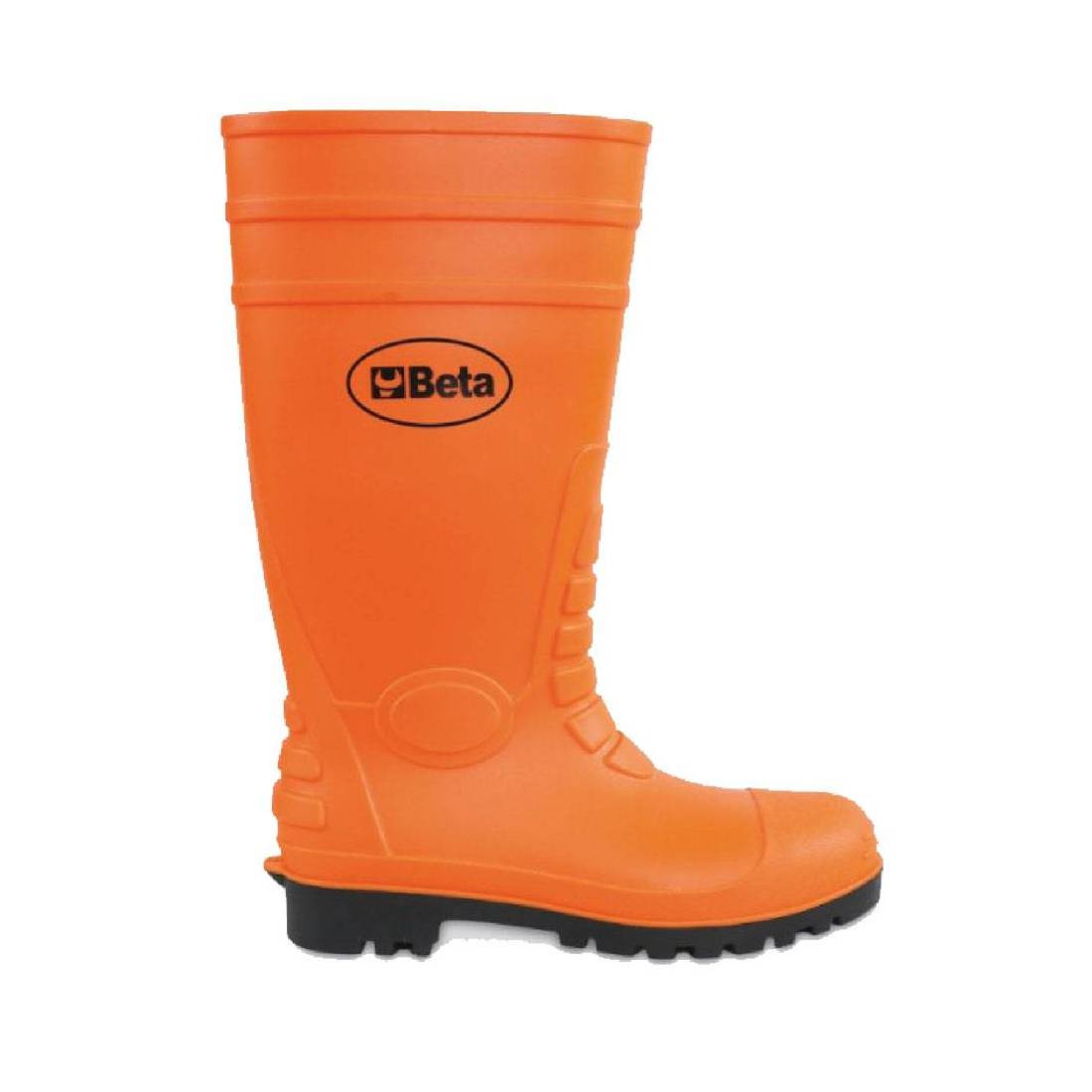 Alta visibilità. Puntale in acciaio, resistenza 200 joule. Lamina antiperforazione in acciaio inox. Suola artigliata antiscivolo in PVC nitrilica. Colore arancione. Protezione S5.