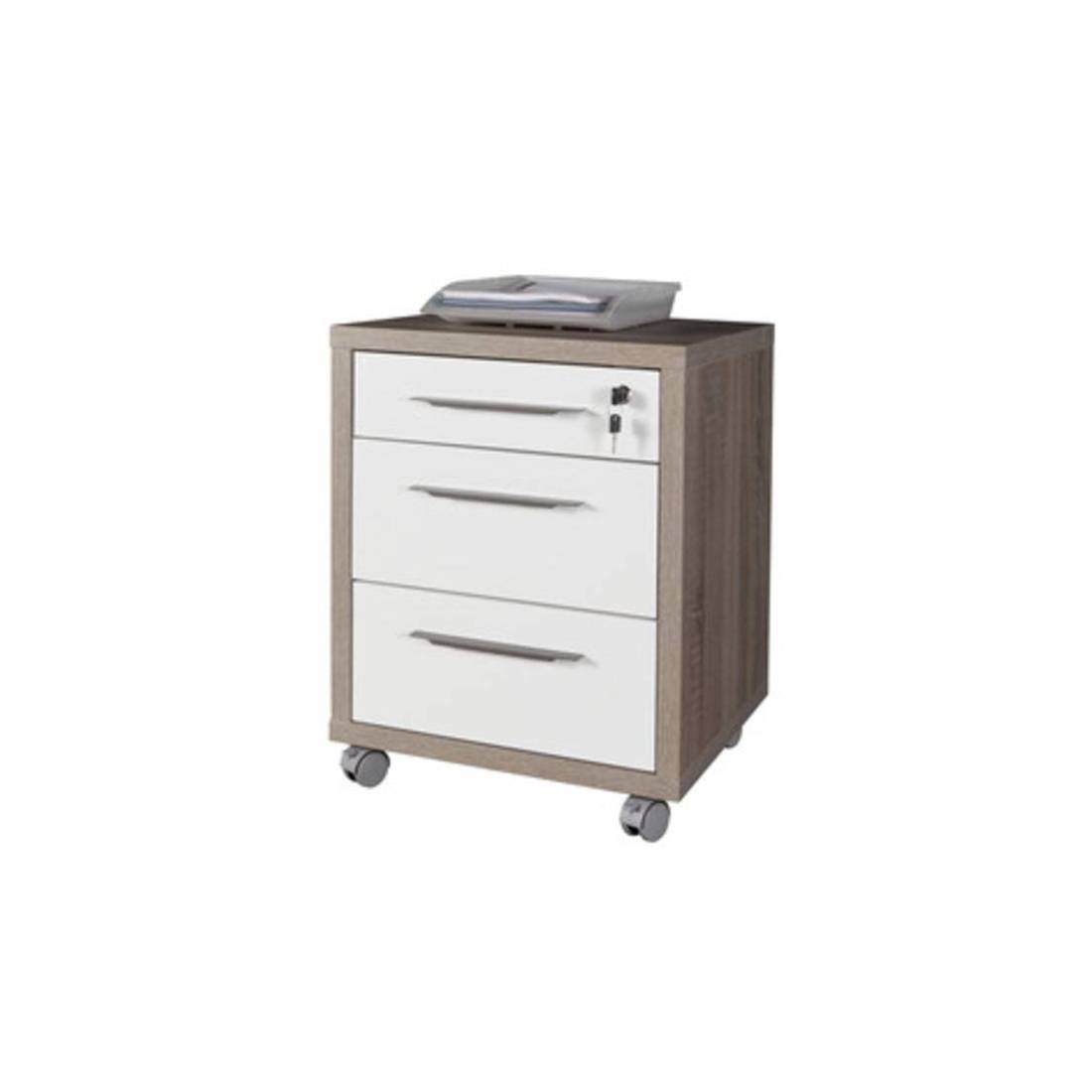 Art. CT4811 K512 A tre cassetti della linea Disegno, color rovere tartufo con finitura vero legno e ante laccato bianco. Grazie al cassetto dotato di chiave per custodire gli effetti personali e alle quattro ruote piroettanti auto frenanti che garantiscono facilit di spostamento. La struttura composta da robusti pannelli in truciolare rivestito in melaminico spessi 30 mm, resistenti e duraturi nel tempo. I cassetti si aprono grazie alla maniglia in acciaio lucido e viaggiano su guide metalliche con fermo cassetto a fine corsa. Dimensioni 49 x 45 x h 63 cm. Da montare.