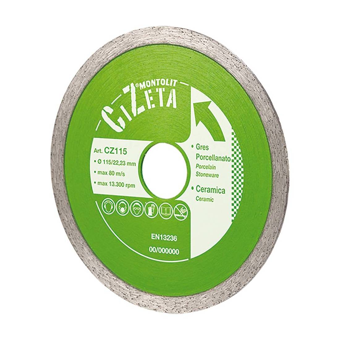 Corona continua liscia. Idoneo per piastrelle in monocottura, cotto, gres porcellanato, piastrelle in marmo. Rispetta la normativa EN13236. Rotazioni 80-13300 g./min. Foro mm 22.