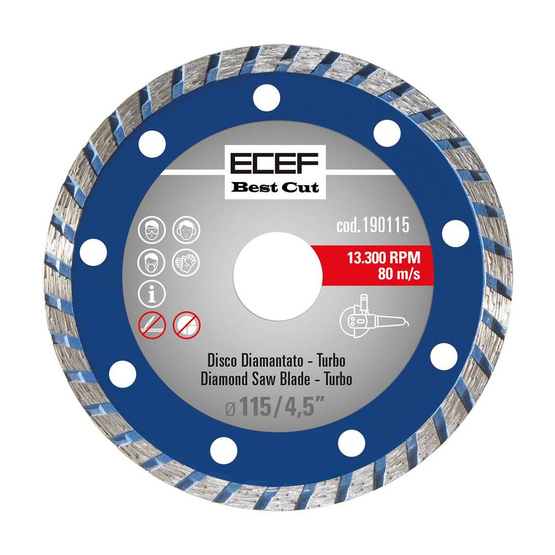Tipo universale. Turbo, corona continua. Idoneo per muro, cemento, piastrelle, pietra, marmo per taglio con e senza acqua. Rotazioni 80-13300 g./min. Foro mm 22,23.