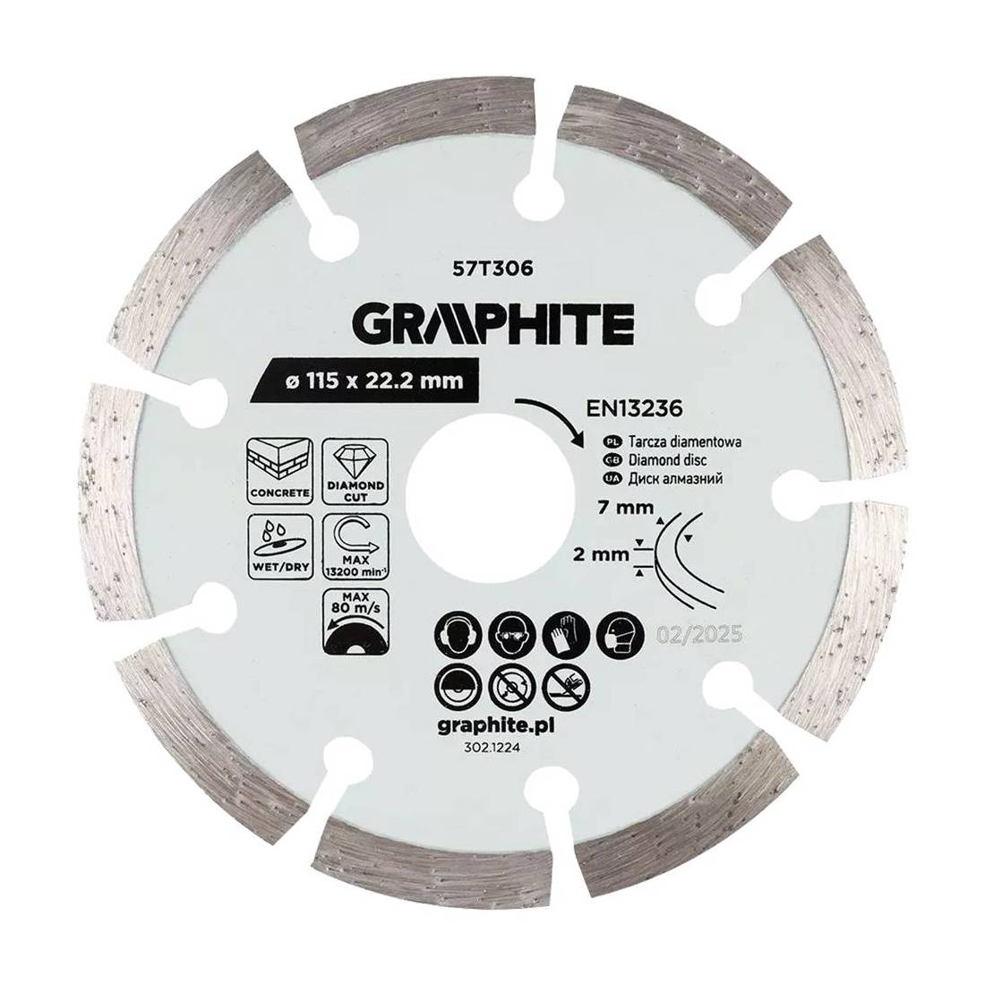 Progettato per il taglio a secco, indicato per un impiego professionale o hobbistico. Ha un diametro di 115 mm con foro di montaggio da 22,2 mm ed è pensato per l' utilizzo con smerigliatrici angolari. La struttura segmentata presenta segmenti con altezza di 7 mm e larghezza di 2 mm, soluzione che favorisce una buona capacità di taglio e una corretta dissipazione del calore durante l' uso. Disco adatto a una velocità massima di 80 m/s, corrispondente a 13.200 giri al minuto.