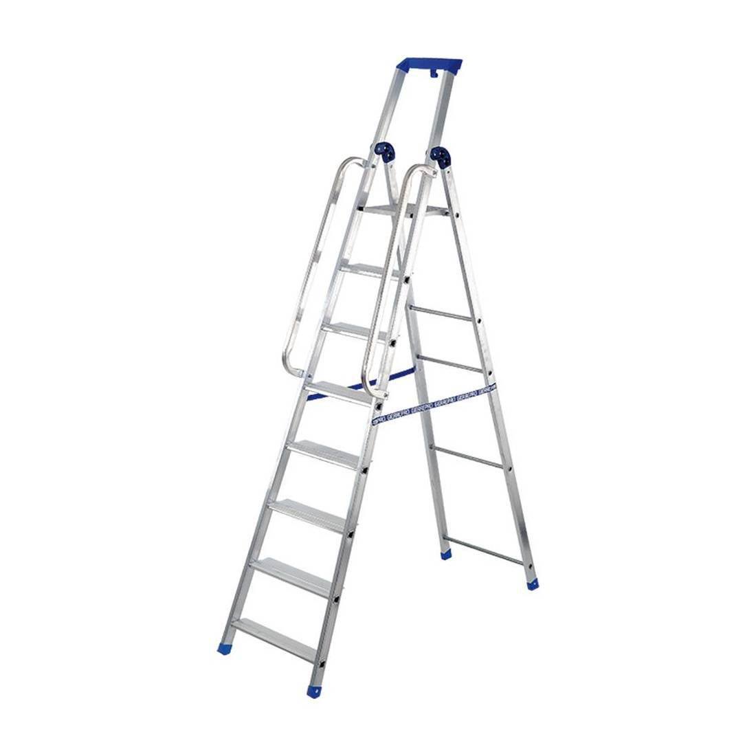 In alluminio. Adatta per lavori professionali. Robusta e stabile, è dotata di una comoda vaschetta porta utensili e supporto per appendere secchi e contenitori. Gradino zigrinato da 110 mm con profilo stondato, struttura portante in tubolare. Piedini in gomma antiscivolo zigrinati. Certificazione a norma EN131, portata 150 kg. Made in Italy.