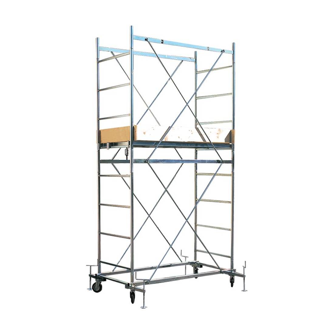 Struttura zincata elettroliticamente. Montanti in tubo tondo di acciaio diametro di 42 mm. Pioli montanti in tubo ovale 30 x 15. Base con quattro livellatori a vite con piattello diametro 100 mm. Sistema rapido di fissaggio, tiranti con automatismo antisfilo involontario, 4 ruote girevoli di cui due con freno diametro 150 mm. Completo di 1 piano di lavoro con botola cm. 84x167, 1 coppia parapetti, 1 kit ancoraggio a parete. Portata kg. 150. H.max di lavoro cm. 615. H.max al piano cm. 415. Dimensioni cm. 178x93xH.520. Obbligo ancoraggio a parete ogni due alzate. Kit alzata da cm. 160.