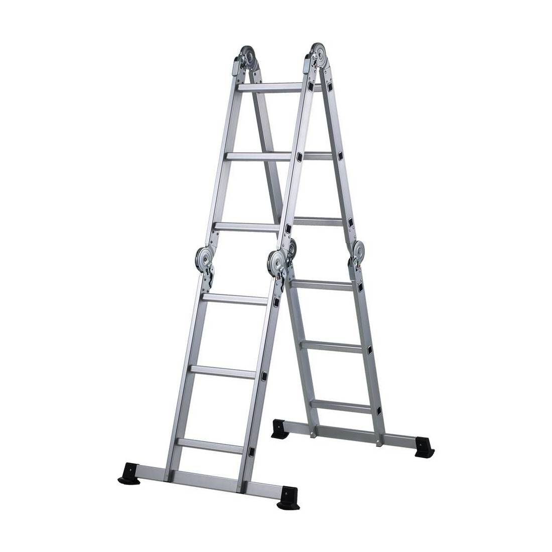 In alluminio anodizzato. Può essere utilizzata in tre configurazioni: doppia, a ponte e tutta estesa. Dotata di sei cerniere in acciaio e di due barre stabilizzatrici da mm 50x20x1,2. Con 3+3+3+3 pioli, piedini antiscivolo zigrinati, spessore profili 1,20 mm. Completa di piattaforma piano appoggio da 1,50 mm di spessore. Dimensioni scala tutta estesa: cm 77x90,5xh.229. Pioli da mm 30x30x1,2. Conforme alle normative vigenti EN 131-1:2015+A1:2019, EN 131-2:2010 + A2:2017, EN 131-3: 2018, EN 131-4:2020. Portata massima 150 kg.