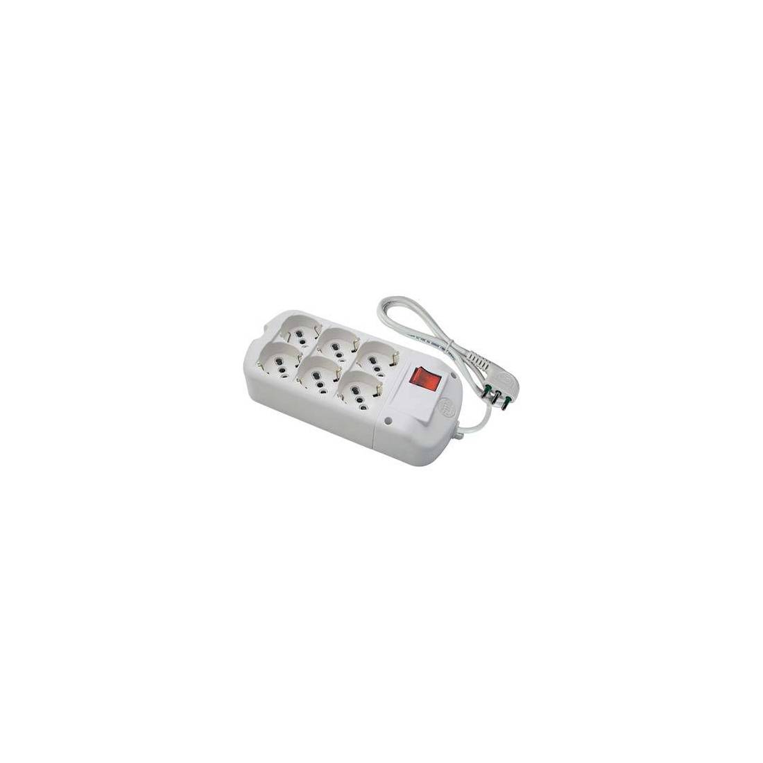 En polycarbonate pour une résistance mécanique élevée. Câble à double isolation HAR H05VV-F homologué, avec serre-câble anti-rupture, section Mmq. 3x1. Fiche moulée sous pression à 90° en PVC 2P+T 16A avec broches protégées. Prises avec alvéoles protégées contre les contacts accidentels et volontaires. Possibilité de fixation au mur à l'aide d'ailettes saillantes. Avec prises schuko bipasse 2P+T 16A. Couleur blanche. Dans un sachet à suspendre.