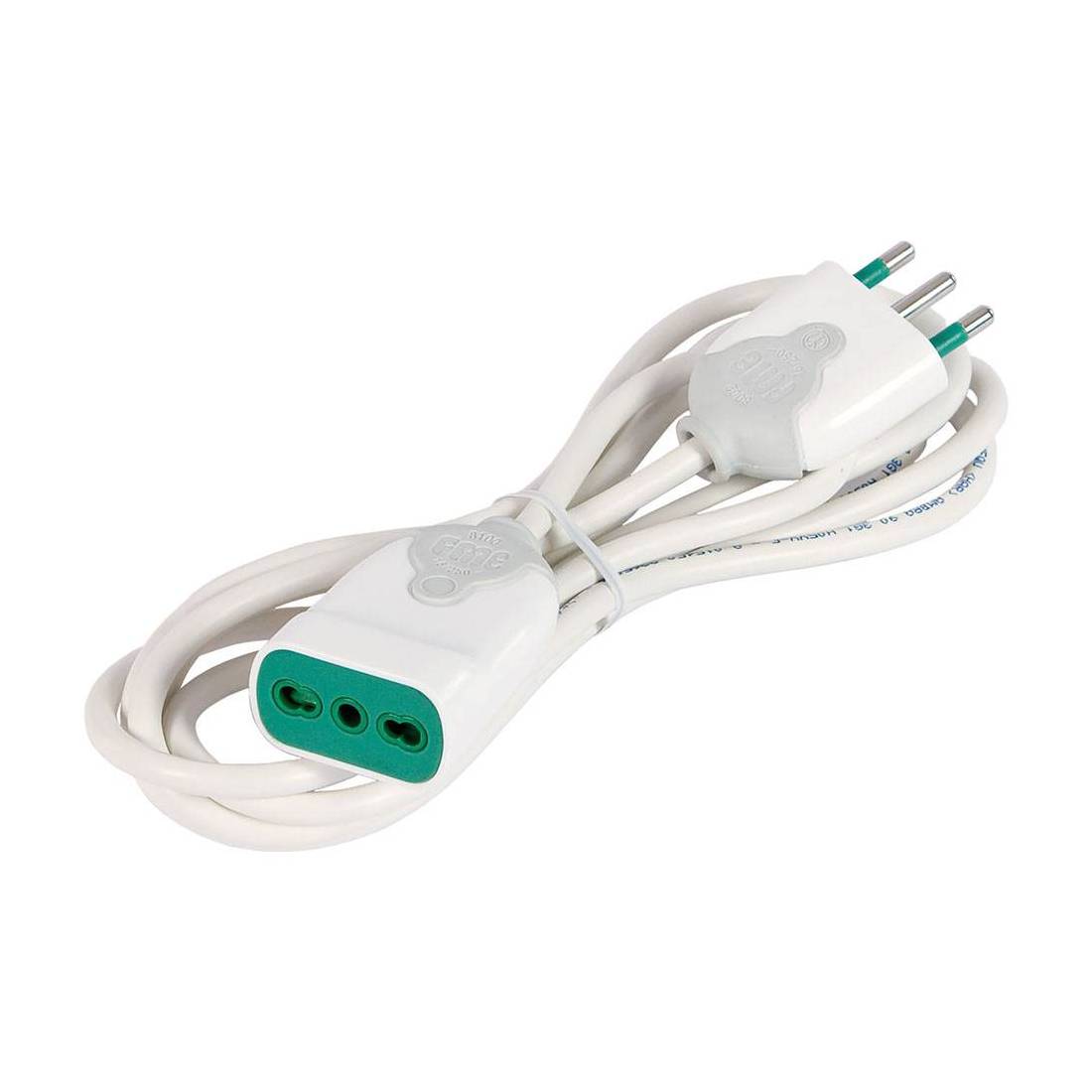 Spina 2P+T 16A, presa 2P+T bipasso. Realizzata in riferimento alle norme CEI 23-50 e CEI 23-124, spina con spinotti allineati a pettine in ottone nichelato annegati e protetti, presa con alveoli in ottone, schermata contro i contatti accidentalie volontari. Cavo flessibile H05VV-F, doppio isolamento, omologato.