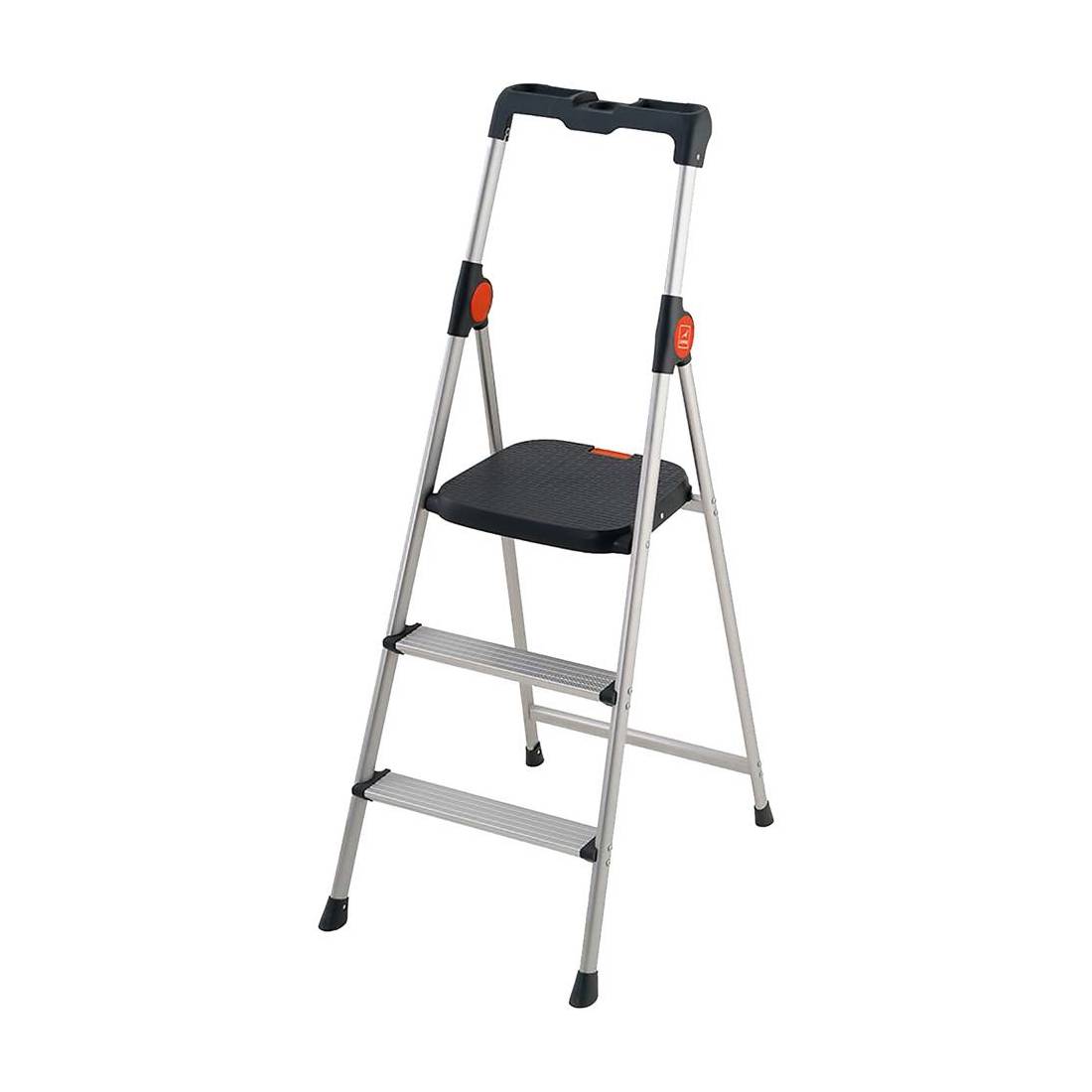 In alluminio anodizzato. Leggerissimo, con piedini antiscivolo zigrinati, piattaforma in plastica con sistema apertura e chiusura con bloccaggio rapido. Vaschetta multifunzione in plastica. Superficie gradini da 10 cm di larghezza. Conforme alle norme vigenti EN131 D.Lgs 81/08. Portata Kg 150. Made in Europe.
