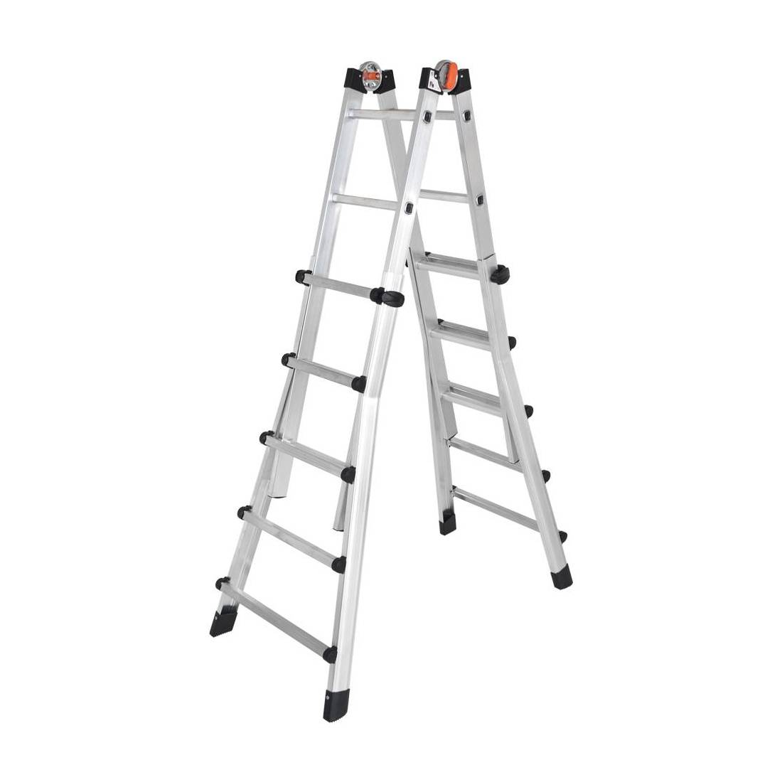 Struttura solida in alluminio. Articolazione in acciaio brevettata, piolo esterno 30x30 mm, fissato con tre punti di saldatura. Sezione montanti 60x22 mm. 3 Configurazioni (a portafoglio / estesa / zoppa). Con piedini antiscivolo. Portata garantita 150 kg (D.Lgs 81/08). Prodotto Made in Italy.
