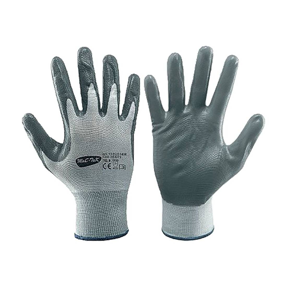 Polsini elasticizzati in maglia, dorso aerato. A filo continuo 100% poliestere-nitrile. Ottima resistenza all'abrasione. Palmo ricoperto in nitrile per maggiore protezione in presenza di oli, grasso e liquidi. Senza cuciture. Conformi alla normativa europea CE EN388:2016. In busta appendibile.
