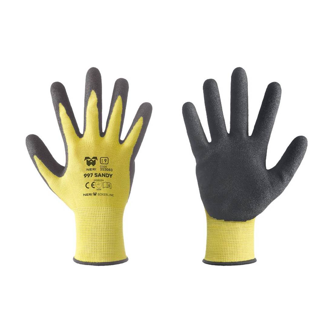 Polsini elasticizzati in maglia, dorso aerato. A filo continuo calibro 13 poliestere-nitrile. Buona resistenza all'abrasione e all'uso. Palmo ricoperto in nitrile sabbiato per maggiore protezione in presenza di oli, grasso e liquidi. Flessibilità e sensiblità tattile. Conformi alla normativa europea CE EN388:2016. Con appendino.