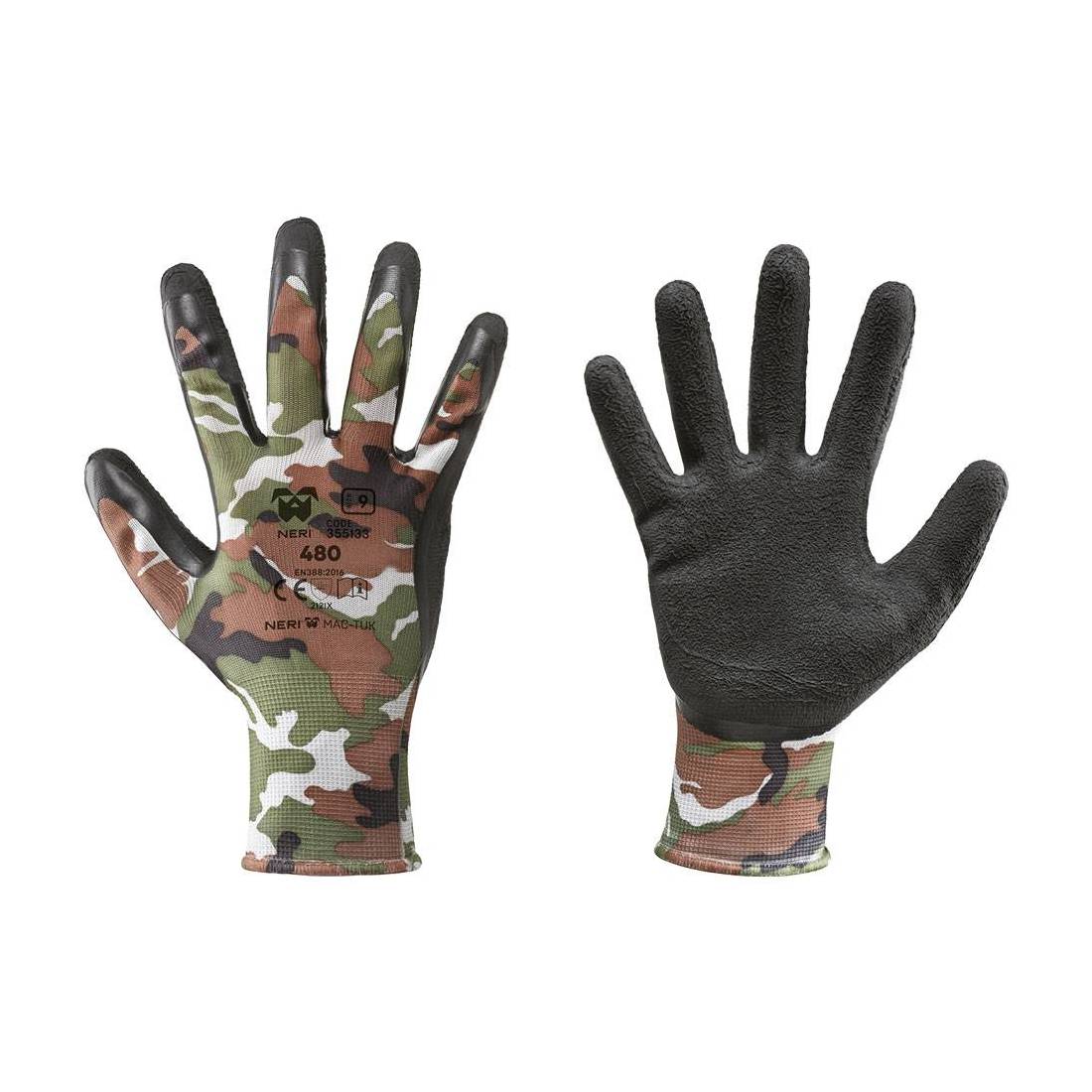 Maglia mimetica con spalmatura in lattice. Supporto in poliestere elasticizzato, palmo ricoperto in lattice schiumato, finitura increspata per presa perfetta su superfici asciutte e bagnate. Ideali per manovalanza in generale, imballaggio, edilizia. CE protezione I, EN 388-2016. In busta appendibile.