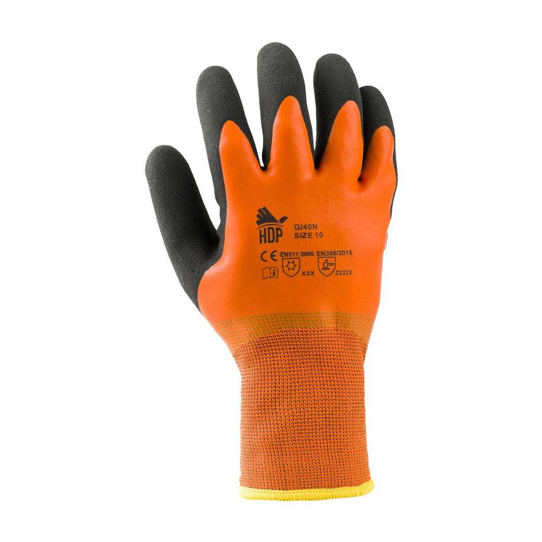 A filo continuo, in poliestere/acrilico, rivestimento in schiuma di lattice. Finitura sandy finish antiscivolo per lavori di manutenzione, pulizia impianti, lavori con attrezzi, carpenteria metallica, manipolazione di profilati metallici, operazioni di smerigliatura e/o sbavatura, falegnameria, manipolazione di oggetti con spigoli vivi, ruvidi, abrasivi. Indicati per protezione dal freddo, per lavori di manutenzione in ambienti refrigerati. Categoria protezione II, rispettano le normative EN 388/16 (rischi meccanici) e EN 511 (protezione contro il freddo). Colore nero/arancio. In busta appendibile.