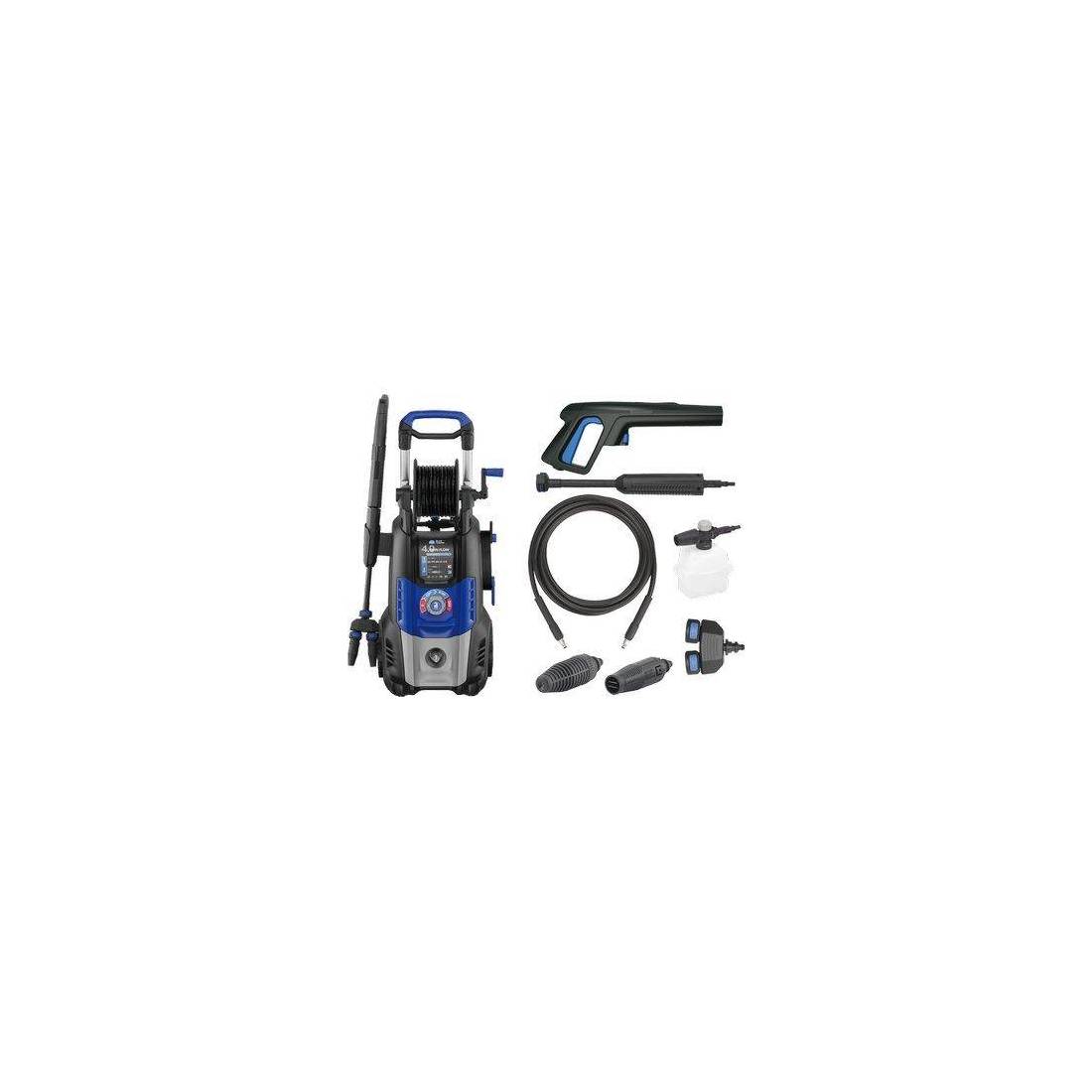 Équipée du système Dualtech Technology System avec 2 pompes à trois pistons axiaux, en mode 2 power units, les deux groupes de pompage fonctionnent à haut rendement. Chariot, pression maximale 150 bars, débit maximal 810 l/h et poids 14 kg. Équipé du Total Stop System, le système d'arrêt total à distance, grâce auquel le nettoyeur haute pression s'éteint automatiquement lorsque vous relâchez le bouton de distribution d'eau. Connexion rapide par clic : le tuyau haute pression se connecte au nettoyeur haute pression et au pistolet en un seul clic. Fourni avec : 1 pistolet, 1 rallonge de lance, 1 buse à jet réglable, 1 buse à jet rotatif, 1 porte-buse double à double buse, 1 tuyau haute pression et 1 kit moussant haute pression.