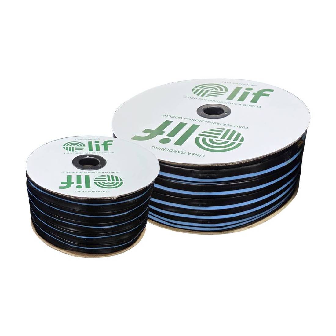 Manichetta gocciolante leggera, dallo spessore di 0,20 mm - 8 mil, con gocciolatore piatto, indicata per l'irrigazione in campo giardino. Realizzata in polietilene di colore nero con striscia azzurra che indica il corretto verso di posa verso l’alto. Idonea per posa in superficie o leggermente interrata. Perdite di carico ridotte e buona uniformità di erogazione anche su lunghe distanze. Filtri integrati che limitano l’ingresso di particelle nel gocciolatore, contribuendo a ridurre il rischio di ostruzioni. Elevata resistenza ai raggi UV e ai prodotti chimici e acidi comunemente utilizzati in agricoltura. Prodotto conforme alla norma UNI EN ISO 9261.