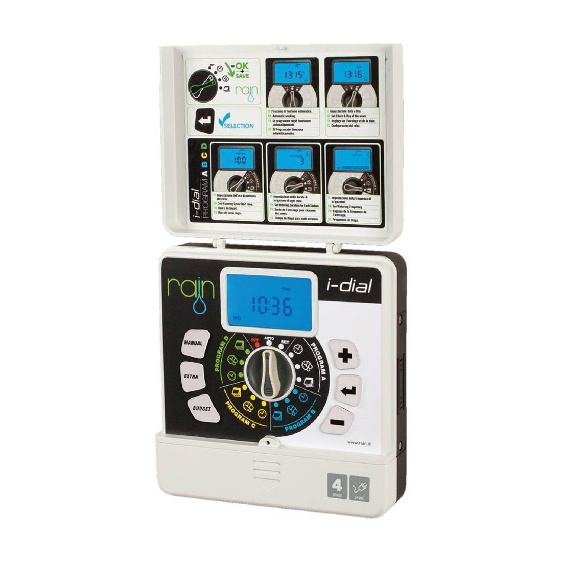 Prodotto di alta qualità e facilità di utilizzo. Modello indoor con trasformatore esterno. Ampio display illuminato. A 4 cicli d'irrigazione indipendenti, 1 partenza ogni programma. Tempi d'irrigazione da 1 a 240 minuti per stazione. Cicli d'irrigazione da 4 al giorno fino a 1 ogni 19 giorni, programma d'irrigazione per giorni settimanali o per intervalli da 1 a 19 giorni. Uscita comando pompa ed ingresso sensore pioggia. Memoria non volatile. Funziona con 2 batterie AA 1,5 volt non incluse. Alimentazione 220 VAC 50Hz.