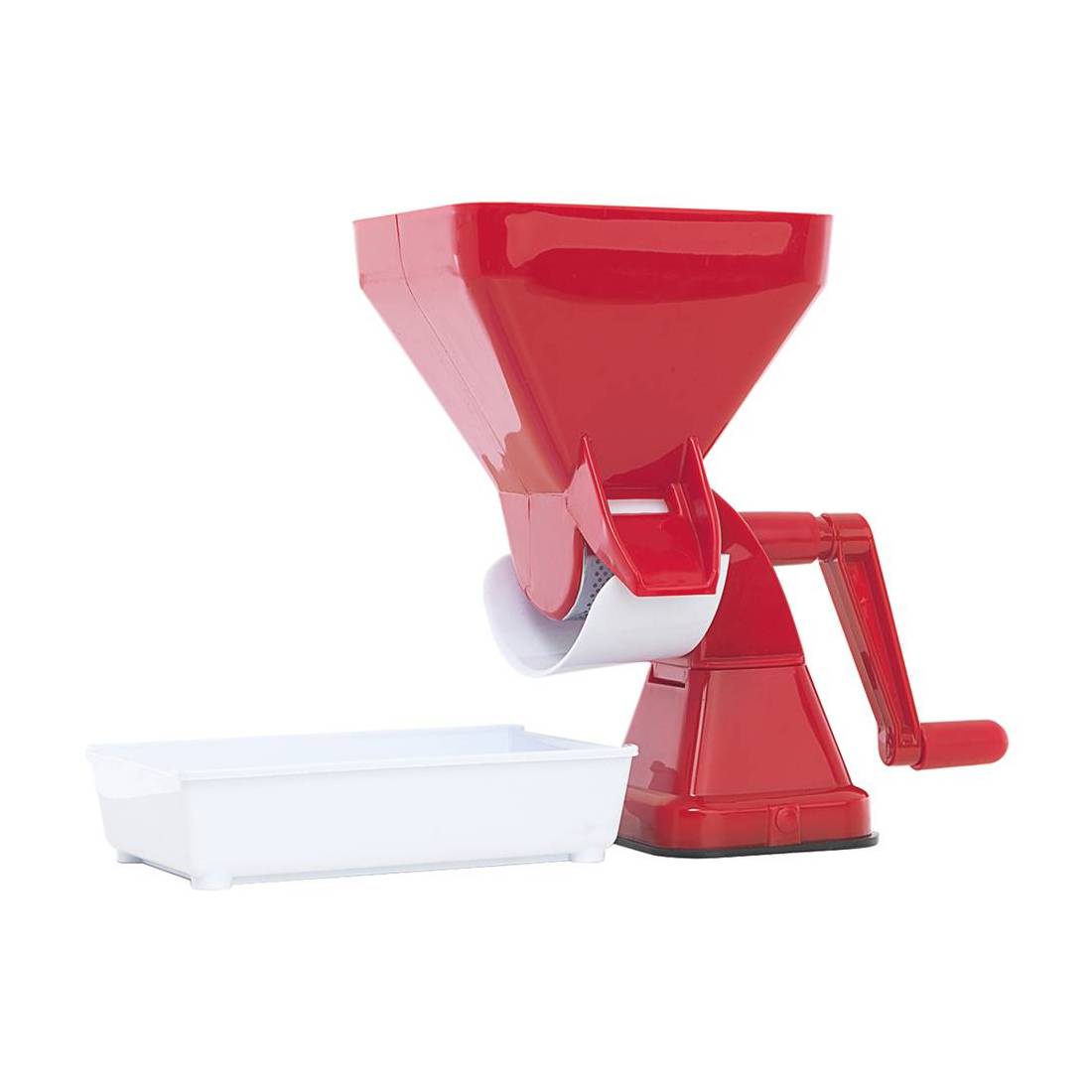 Funzione manuale. In polipropilene per uso alimentare. Rullo in nylon, scivolo, vaschetta e manovella in plastica, ventosa in gomma per maggiore stabilità su piano. Setaccio in acciaio.