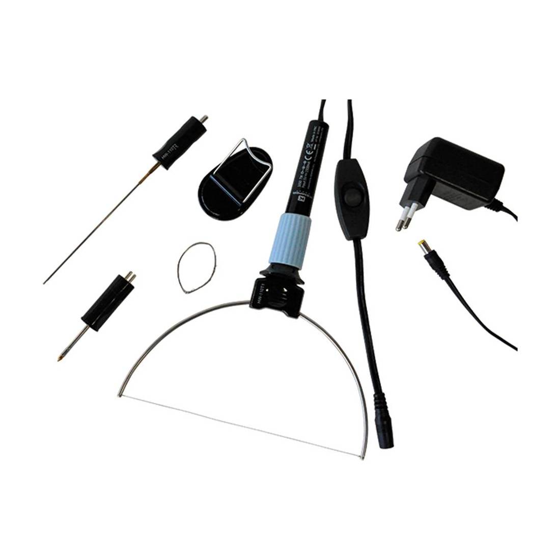 Tipo professionale. Con archetto per sagomare, lama lunga per tagliare, lama corta per rifinire. Filo di metallo di ricambio per archetto incluso. Voltaggio alimentatore 230V/50Hz. In blister.