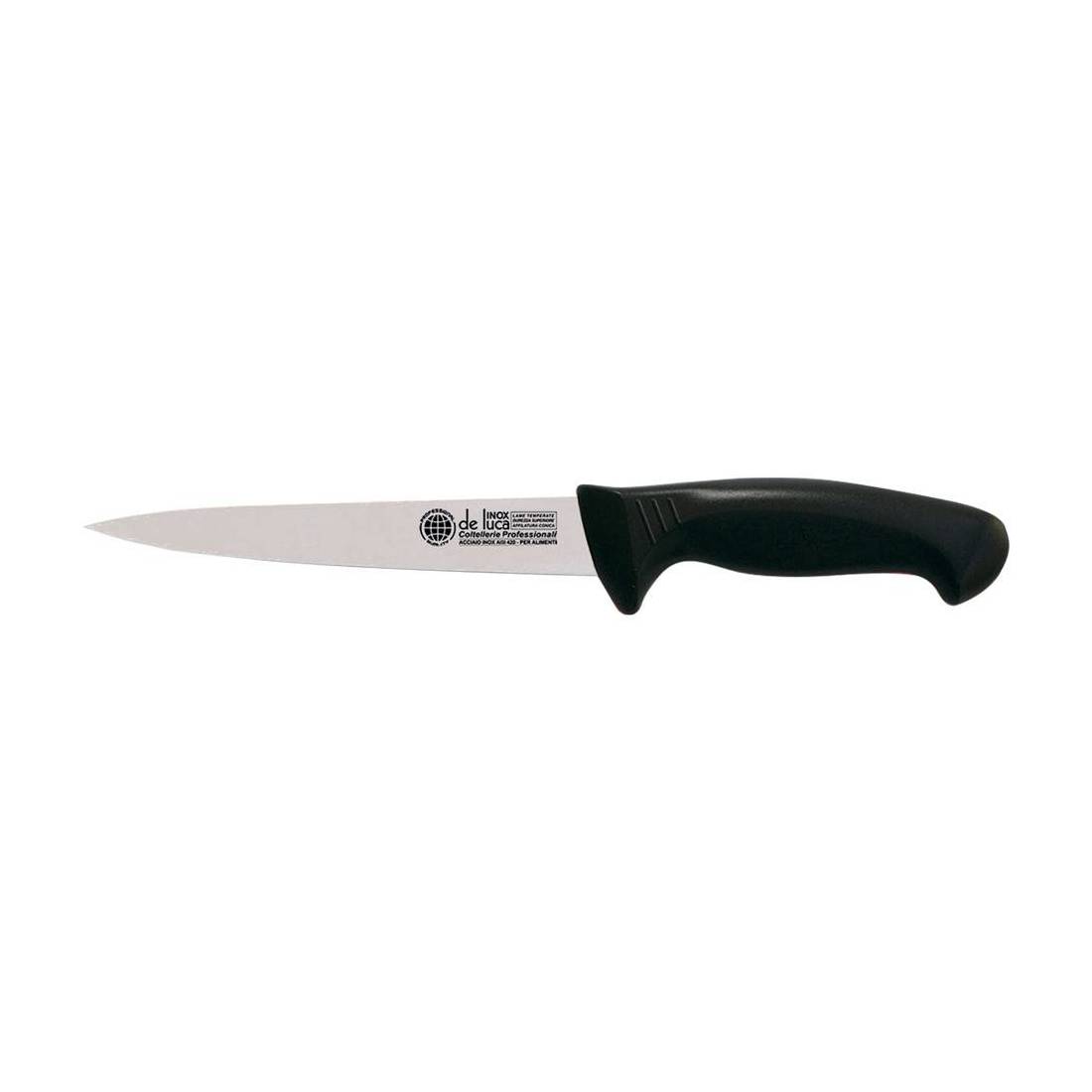 Lama in acciaio inox temprato AISI 420 per alimenti. Manico realizzato in materiale termoplastico antiscivolo. Spessore lama 3,0 mm. In blister.