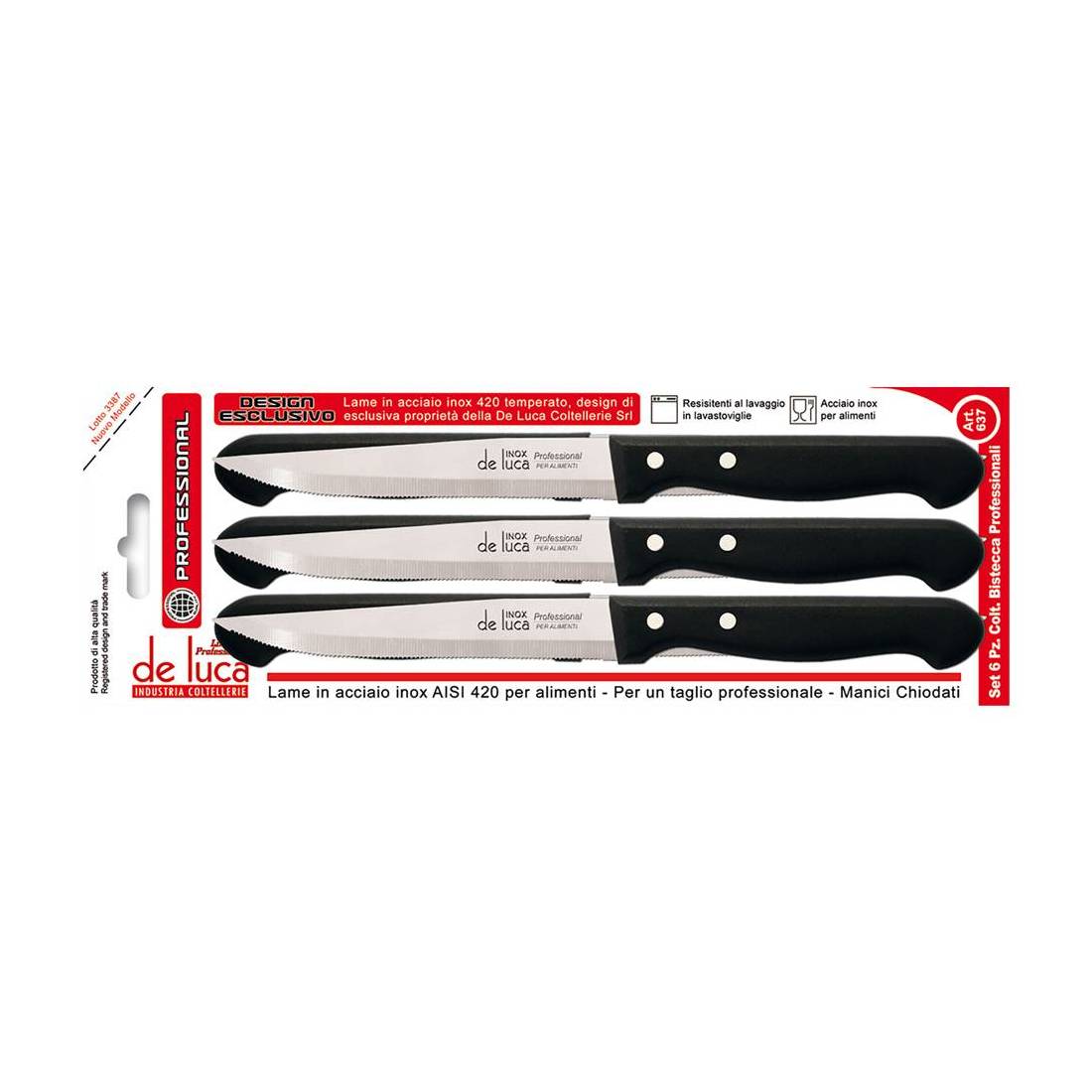Set 6 pezzi. Lama in acciaio inox per alimenti da cm 11. Manico indeformabile in polipropilene chiodato di colore nero. In blister.