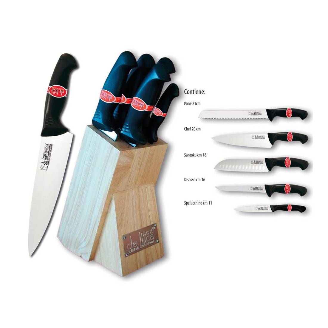 Lame in acciaio inox temprato aisi 420, affilatura conica. Contenuto set: coltello Pane 210 mm, coltello Chef 200 mm, coltello Santoku 180 mm, coltello Disosso 160 mm, coltello Spelucchino 110 mm.