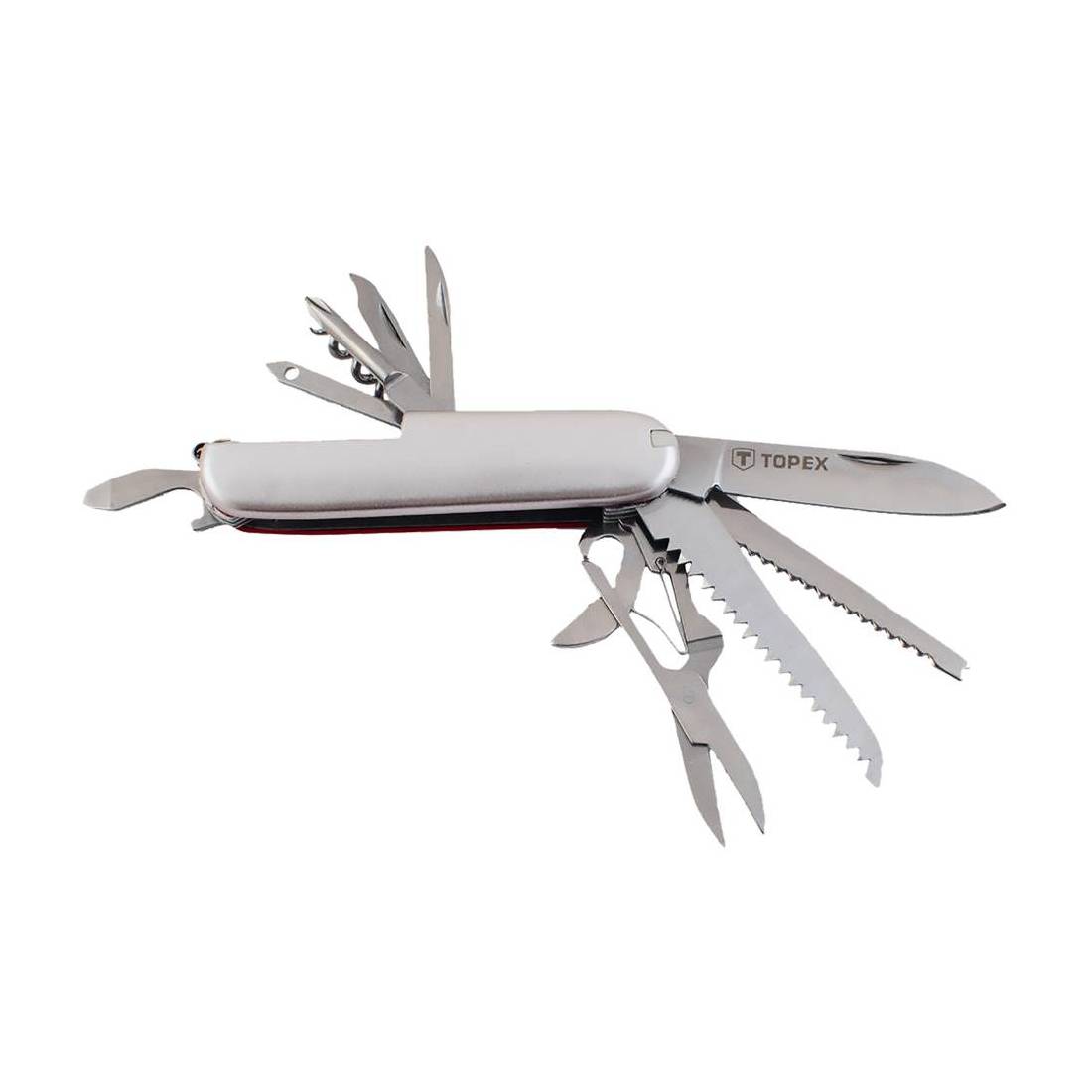 Funzioni: lama diritta per taglio mm 60, apriscatole, apribottiglie, levatappi, lama per squamatura, 2 lame sega legno, forbici, alesatore, cacciavite, lama fine.