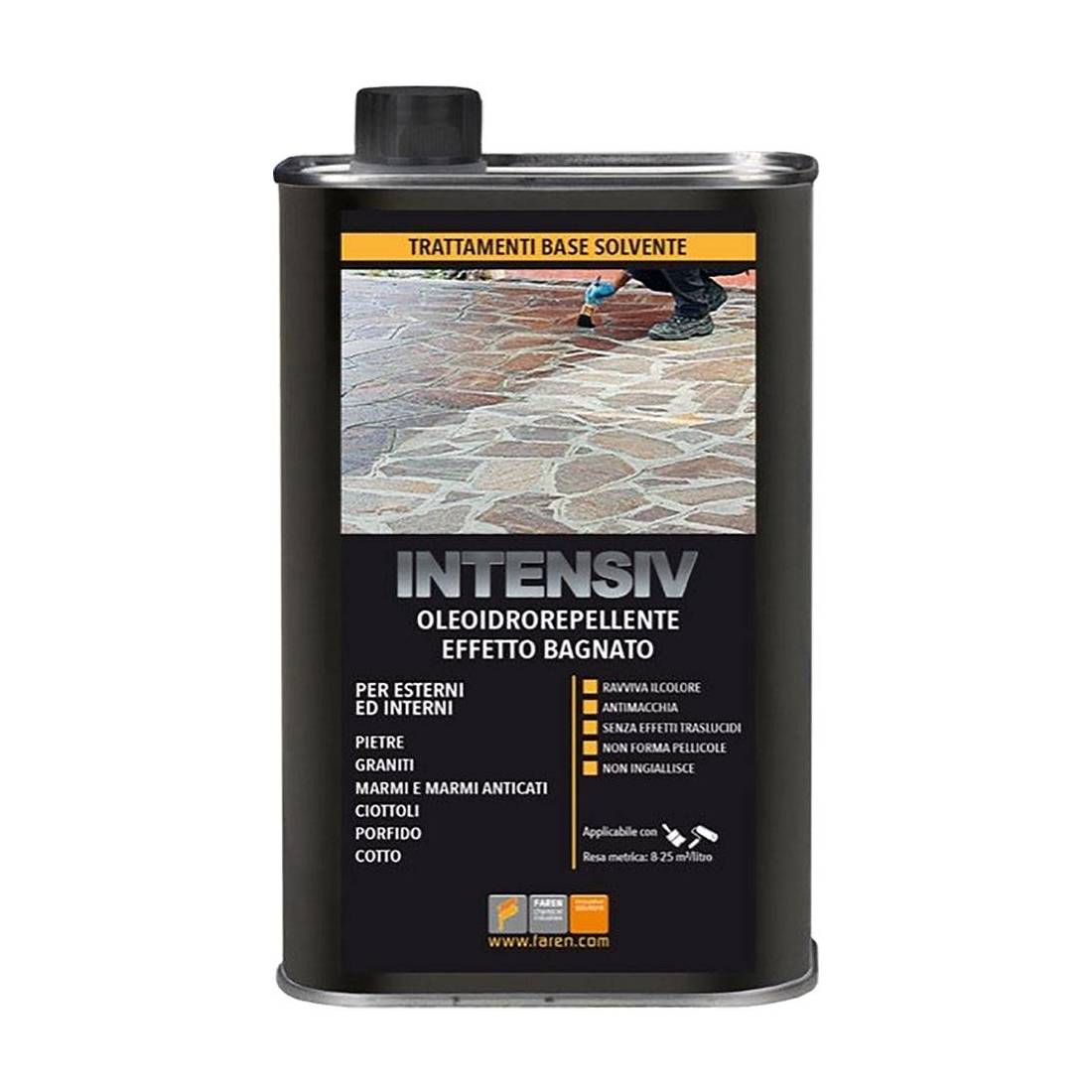 Trattamento oleo idrorepellente effetto bagnato a base solvente, ideale per l'applicazione su pietre naturali, marmi, ciottoli, porfido e cotto. Liquido di colore giallognolo, esalta il colore naturale ed originale, non forma pellicole, non ingiallisce, resiste ai raggi UV, non crea effetti traslucidi. Applicabile con rullo o pennello, resa 8-25 mq/lt. In latta.