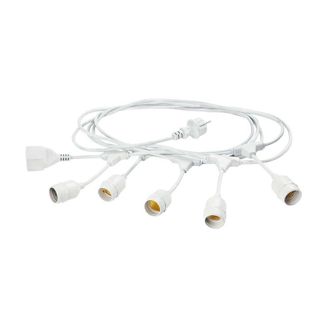 Potenza max lampadine 20W, portalampade E27, grado di protezione IP43. Cavo extra flessibile, spina e presa schuko 2P IP43. Utilizzabile in esterno da -25°C a +60°C. Prolungabile con attacco di altri elementi.