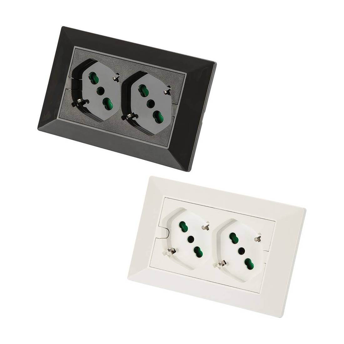 Completa di placca. Con 2 biprese 2P+T10/16A + 2P+T Schuko. Prodotto brevettato. Indispensabile per esigenze di più alimentazioni in poco spazio. Alveoli in ottone schermati, precablata, fissaggio placca ad incastro. Tensione 250V, 50/60Hz, portata massima 3500 W. Marchio CE, va installata su scatola a tre moduli senza bisogno di supporti.