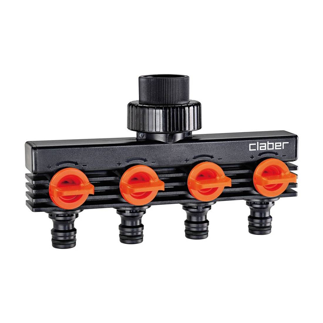 Consente l'allaccio di quattro linee ad un'unica presa d'acqua. Ogni linea è comandata in modo indipendente dal proprio rubinetto. Con innesti.
