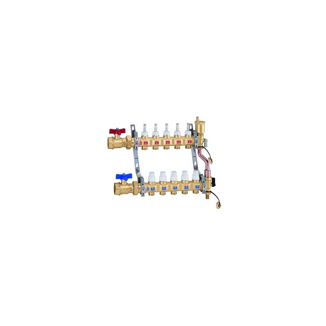 Dérivations 3/4" M . Composé de : collecteur de refoulement avec débitmètres et vannes de régulation ; collecteur de retour avec vannes d'arrêt intégrées, groupes de tête complets avec vannes à bille multiposition, kit excentrique de dérivation complet avec tuyauterie de raccordement, vannes d'arrêt à bille, pinces de fixation.(DianFlex) Dimensions : 1" 1/4 F x 9