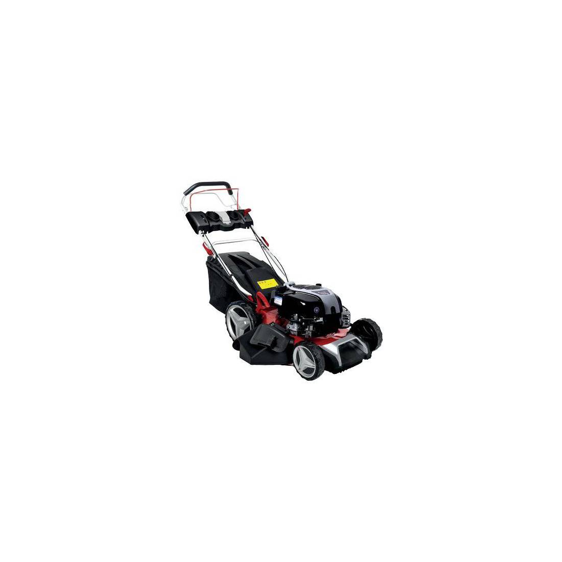 Autopropulsé, moteur Honda GCV200 4 temps, cylindrée 224 cm³, puissance 4,2 kW. Châssis en acier et roues arrière surdimensionnées. Fonction mulching avec éjection latérale. Avec 8 hauteurs de coupe de 30 à 80 mm, à réglage centralisé. Panier de ramassage en ABS rigide/filet de 60 litres. Poignée soft grip et masque de commande.