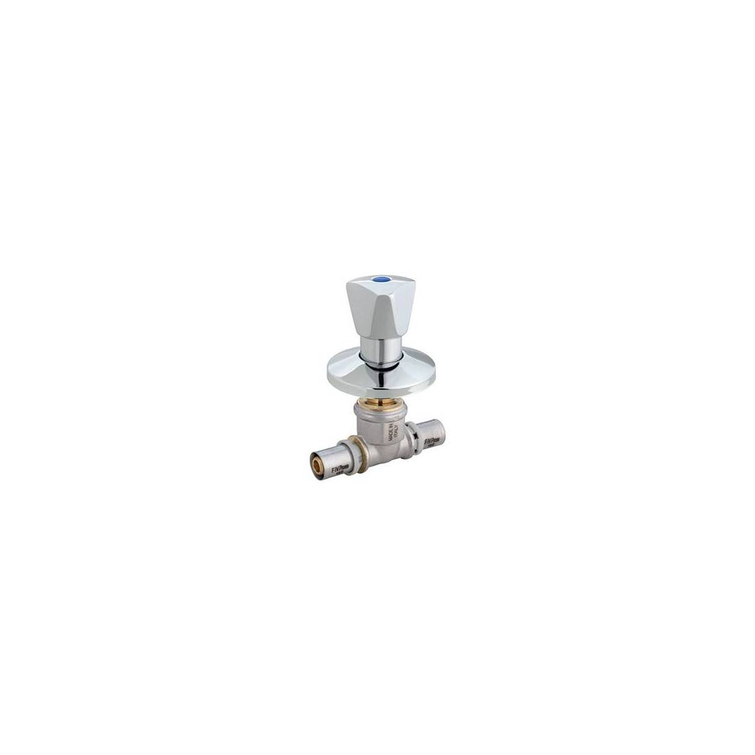 Vanne encastrée avec volant et rosace, chromée. GP2600 FIVPRESS. Corps UNI EN 12165 CW617N - DW / Corps UNI EN 12164 CW617N - DW. Joint et étanchéité en EPDM. Température maximale de service 95 °C. Pression maximale de service à 95 °C : 6 bars (DianFlex) Dimensions : 20 x 20