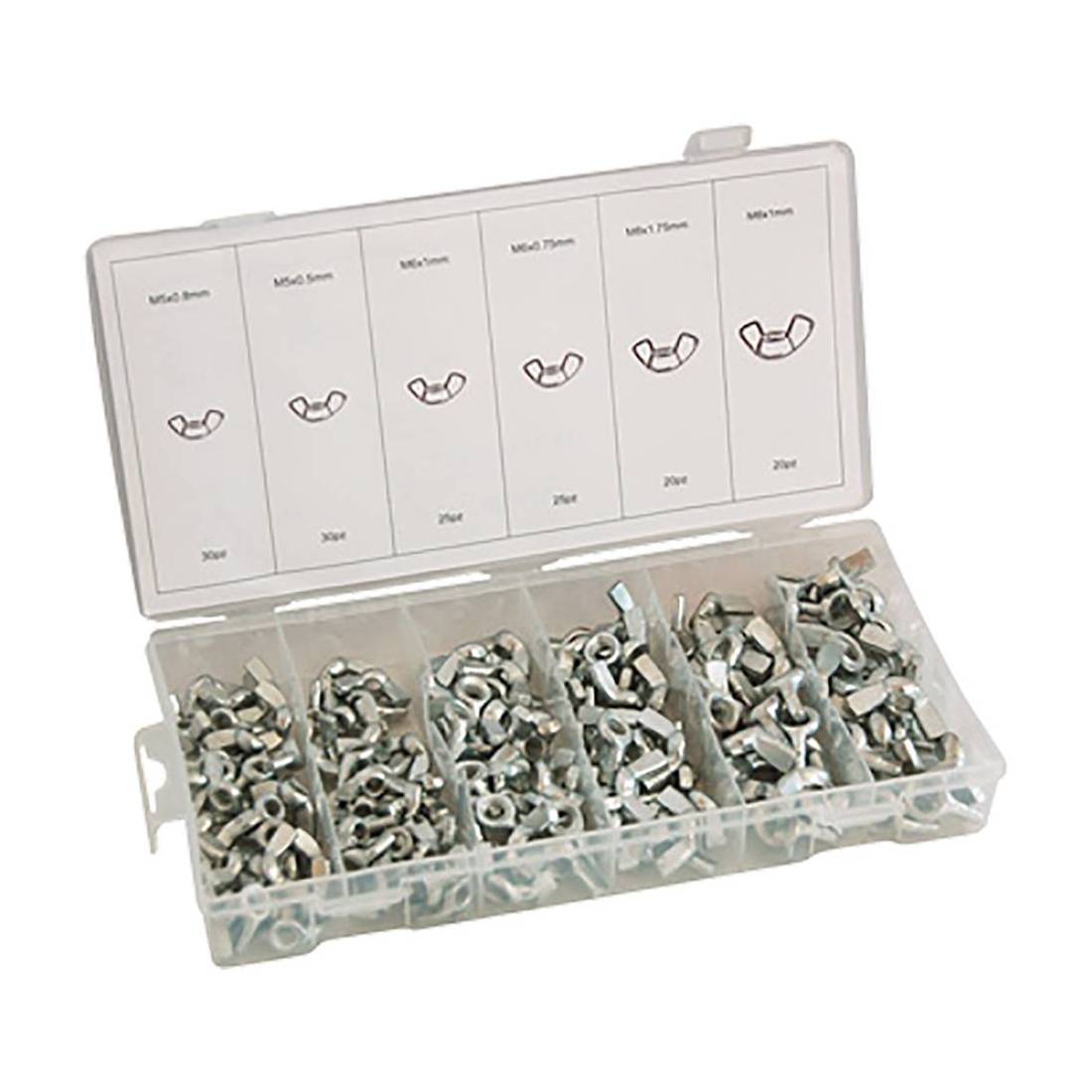 Realizzati in acciaio zincato. In 6 formati di diverse dimensioni: 30 pezzi M5x0,8 mm, 30 pezzi M5x0,5 mm, 25 pezzi M6x1 mm, 25 pezzi M6x0,75 mm, 20 pezzi M8x1,75 mm, 20 pezzi M8x1 mm. In cassetta plastica.