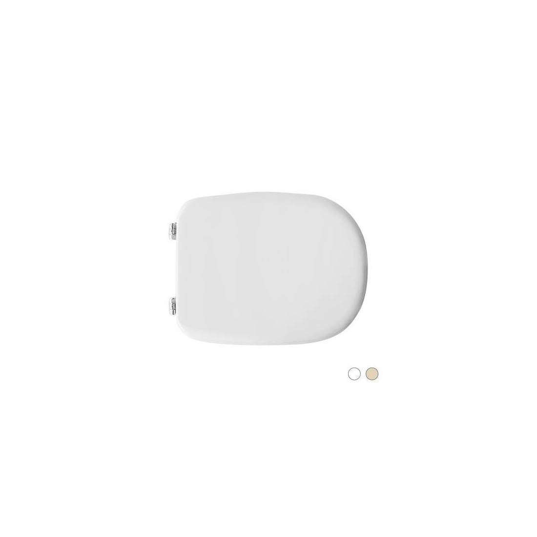 Siège (forme type 6 - charnières type A) dédié à la série Tesi de Ideal Standard. Dimensions : longueur 39-44,3 cm ; largeur 33,7 cm ; entraxe des charnières 10,5-21 cm, modèle avec charnières réglables. Siège en bois stabilisé, moulé en polyester. Charnières en laiton chromé et vis de fixation en acier inoxydable. (DianFlex) Dimensions : Champagne