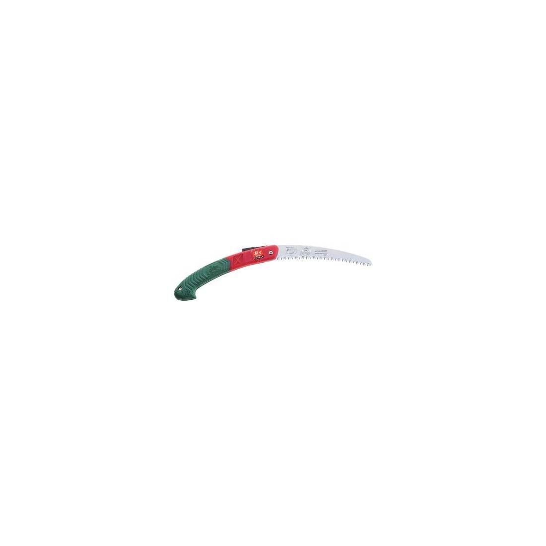 Lame en acier chromé, rectifiée concave pour limiter les frottements. Dents à pas de 4 mm, avec triple affûtage et trempées par impulsions. À cran d'arrêt avec fermeture à cliquet. Manche ergonomique Power Grip. Idéal pour couper au-dessus de la hauteur des épaules.