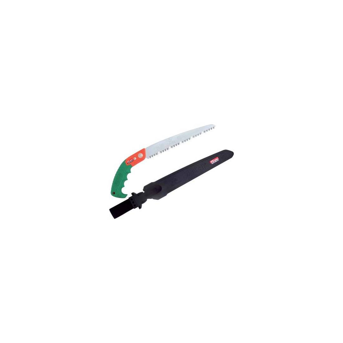 Lame en acier chromé, rectifiée concave pour limiter les frottements. Dents à pas de 4 mm, à triple affûtage, trempées par impulsions. Avec des dents à rabotage alternant des espaces creux pour éliminer la sciure lors de la coupe de bois plus tendres. Manche ergonomique avec poignée pistolet. Livré avec étui. Idéal pour couper en dessous de la hauteur des épaules.